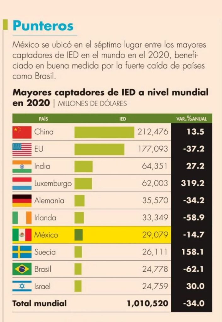 La clasificación de los 10 mayores receptores de IED en 2020 incluyó además a Alemania (35,570 mdd), Irlanda (33,349 mdd), Suecia (26,111 mdd) y Brasil (24,778 mdd).