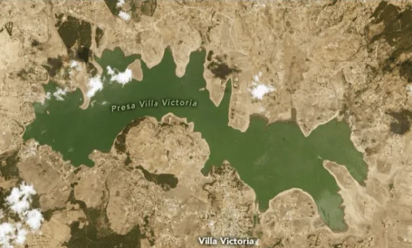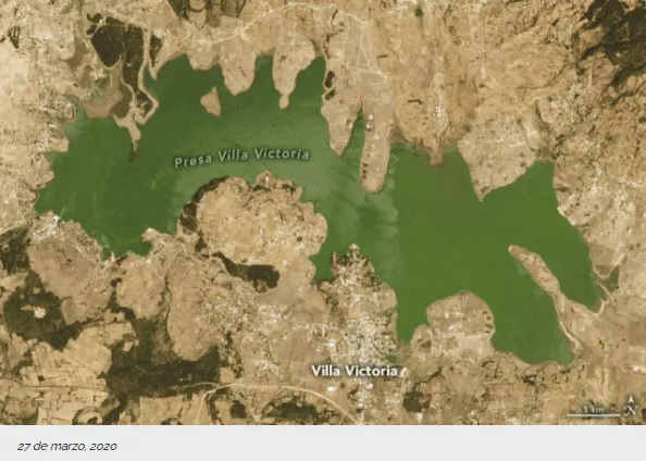 C.omo ejemplo la NASA mostró la comparación de la presa Villa Victoria (poniente al Estado de México), donde se compara el nivel de agua del 27 de marzo de 2020 con el 30 de marzo de 2021 evidenciando como los niveles de agua han disminuido aproximadamente un tercio de su capacidad normal.