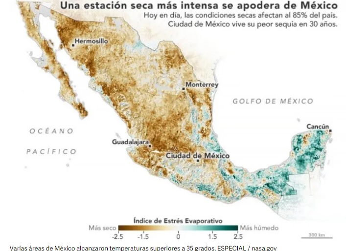 De acuerdo con la NASA, el 15 de abril de 2021, casi el 85 por ciento del país enfrenta condiciones de sequía y presas en todo México se encuentran en niveles “excepcionalmente bajos”, lo que agota recursos para beber, cultivar y regar.